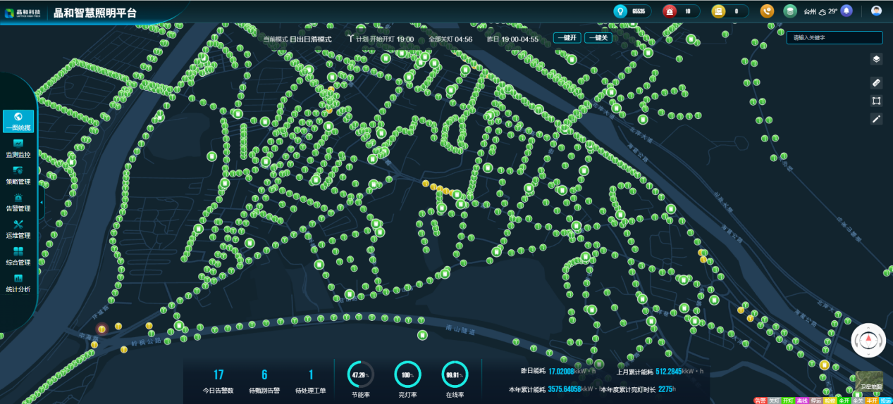 中節(jié)能晶和城市智慧照明管理平臺 晶和科技基于自主研發(fā)的城市智慧照明管理平臺,通過運用NB-Iot、4Gcat.1等先進技術,將LED照明燈具接入平臺系統(tǒng),實現遠程燈光控制、城市照明一圖統(tǒng)覽、監(jiān)控監(jiān)測、策略管理、告警管理、運維管理等功能,做到按需照明和精細化管理,提高城市照明運行的可靠性與響應速度,點亮數字城市建設的“節(jié)能之路”。 與行業(yè)內同類型平臺相比,該平臺具有安全性更高、兼容開放性更強、人力成本更低等多項顯著優(yōu)勢。目前,該平臺已經在北京、寧夏銀川、安徽合肥、江西南昌等20多個城市部署應用,管理燈具近60萬盞。