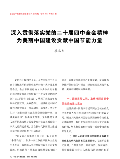 深入貫徹落實(shí)黨的二十屆四中全會(huì)精神 為美麗中國(guó)建設(shè)貢獻(xiàn)中國(guó)節(jié)能力量 廖家生 黨的二十屆四中全會(huì),是在向第二個(gè)百年奮斗目標(biāo)進(jìn)軍的新征程上舉行的一次十分重要的會(huì)議。全會(huì)審議通過(guò)的《中共中央關(guān)于制定國(guó)民經(jīng)濟(jì)和社會(huì)發(fā)展第十五個(gè)五年規(guī)劃的建議》(以下簡(jiǎn)稱《建議》),擘畫(huà)了未來(lái)五年發(fā)展的宏偉藍(lán)圖,是乘勢(shì)而上、接續(xù)推進(jìn)中國(guó)式現(xiàn)代化建設(shè)的又一次總動(dòng)員、總部署。全會(huì)專門(mén)對(duì)“加快經(jīng)濟(jì)社會(huì)發(fā)展全面綠色轉(zhuǎn)型,建設(shè)美麗中國(guó)”作出重大部署,充分體現(xiàn)了以習(xí)近平同志為核心的黨中央對(duì)生態(tài)文明建設(shè)一以貫之的高度重視,為在新時(shí)代新征程上推進(jìn)美麗中國(guó)建設(shè)提供了行動(dòng)指南。 中國(guó)節(jié)能環(huán)保集團(tuán)有限公司(以下簡(jiǎn)稱“中國(guó)節(jié)能”)作為一家以節(jié)能環(huán)保為主業(yè)的中央企業(yè),始終深入學(xué)習(xí)貫徹習(xí)近平生態(tài)文明思想,積極踐行“綠水青山就是金山銀山”理念,依托節(jié)能環(huán)保全產(chǎn)業(yè)鏈優(yōu)勢(shì),努力成為節(jié)能環(huán)保行業(yè)的引領(lǐng)者、綠色低碳發(fā)展的示范者、美麗中國(guó)建設(shè)的推動(dòng)者。 一、提高思想認(rèn)識(shí),準(zhǔn)確把握美麗中國(guó)建設(shè)的重大意義 建設(shè)美麗中國(guó)是以習(xí)近平同志為核心的黨中央著眼人與自然和諧共生的現(xiàn)代化建設(shè)全局,順應(yīng)人民群眾對(duì)美好生活期盼所作出的重大戰(zhàn)略部署。我們要深刻領(lǐng)會(huì)其重大意義和豐富內(nèi)涵,切實(shí)把思想和行動(dòng)統(tǒng)一到黨中央決策部署上來(lái)。 (一)深刻認(rèn)識(shí)建設(shè)美麗中國(guó)是全面建設(shè)社會(huì)主義現(xiàn)代化國(guó)家的重要目標(biāo)。習(xí)近平總書(shū)記強(qiáng)調(diào),“尊重自然、順應(yīng)自然、保護(hù)自然,是全面建設(shè)社會(huì)主義現(xiàn)代化國(guó)家的內(nèi)在要求”,要以美麗中國(guó)建設(shè)全面推進(jìn)人與自然和諧共生的現(xiàn)代化。綠色發(fā)展是中國(guó)式現(xiàn)代化的鮮明底色。作為節(jié)能環(huán)保領(lǐng)域的骨干央企,中國(guó)節(jié)能必須始終堅(jiān)持把美麗中國(guó)建設(shè)擺在強(qiáng)國(guó)建設(shè)、民族復(fù)興的突出位置,把服務(wù)美麗中國(guó)建設(shè)作為踐行“兩個(gè)維護(hù)”的具體行動(dòng),堅(jiān)決扛起生態(tài)文明建設(shè)主力軍責(zé)任,持續(xù)為建設(shè)人與自然和諧共生的現(xiàn)代化貢獻(xiàn)力量,奮力繪就全面推進(jìn)美麗中國(guó)建設(shè)的新畫(huà)卷。 (二)深刻認(rèn)識(shí)建設(shè)美麗中國(guó)是實(shí)現(xiàn)經(jīng)濟(jì)社會(huì)高質(zhì)量發(fā)展的必由之路。習(xí)近平總書(shū)記強(qiáng)調(diào),要站在人與自然和諧共生的高度謀劃發(fā)展,通過(guò)高水平環(huán)境保護(hù),不斷塑造發(fā)展的新動(dòng)能、新優(yōu)勢(shì)。我國(guó)生態(tài)本底脆弱,經(jīng)濟(jì)社會(huì)綠色低碳轉(zhuǎn)型任務(wù)依然艱巨,必須堅(jiān)定不移走綠色發(fā)展道路,以高品質(zhì)生態(tài)環(huán)境支撐高質(zhì)量發(fā)展。走綠色低碳發(fā)展之路,是新時(shí)代國(guó)有企業(yè)更好履行戰(zhàn)略使命、實(shí)現(xiàn)高質(zhì)量發(fā)展的重要途徑和必然要求。對(duì)中國(guó)節(jié)能來(lái)說(shuō),就是要完整、準(zhǔn)確、全面貫徹新發(fā)展理念,深入落實(shí)降碳、減污、擴(kuò)綠、增長(zhǎng)總要求,積極探索生態(tài)優(yōu)先、綠色發(fā)展的新路徑、新模式,努力做強(qiáng)做優(yōu)做大節(jié)能環(huán)保主業(yè),助力經(jīng)濟(jì)社會(huì)發(fā)展全面綠色轉(zhuǎn)型和高質(zhì)量發(fā)展。 (三)深刻認(rèn)識(shí)建設(shè)美麗中國(guó)是滿足人民群眾美好生活需要的必然要求。習(xí)近平總書(shū)記強(qiáng)調(diào),環(huán)境就是民生,青山就是美麗,藍(lán)天也是幸福;良好的生態(tài)環(huán)境是最公平的公共產(chǎn)品,是最普惠的民生福祉。建設(shè)美麗中國(guó),就是要積極回應(yīng)人民群眾的所想、所盼、所急,提供更多優(yōu)質(zhì)生態(tài)產(chǎn)品,不斷滿足人民日益增長(zhǎng)的優(yōu)美生態(tài)環(huán)境需要,提升人民的獲得感、幸福感、安全感。中國(guó)節(jié)能所從事的都是與人民群眾密不可分的民生事業(yè),要深入踐行以人民為中心的發(fā)展思想,發(fā)揮好主責(zé)主業(yè)優(yōu)勢(shì),履行好生態(tài)保護(hù)責(zé)任,著力解決損害人民群眾健康的突出環(huán)境問(wèn)題,讓人民群眾在綠水青山中共享自然之美、生命之美、生活之美。 (四)深刻認(rèn)識(shí)建設(shè)美麗中國(guó)是彰顯共建清潔美麗世界大國(guó)擔(dān)當(dāng)?shù)纳鷦?dòng)實(shí)踐。習(xí)近平總書(shū)記強(qiáng)調(diào),建設(shè)美麗家園是人類的共同夢(mèng)想。面對(duì)氣候變化、生物多樣性喪失等全球生態(tài)環(huán)境挑戰(zhàn),人類是一榮俱榮、一損俱損的命運(yùn)共同體。美麗中國(guó)建設(shè)