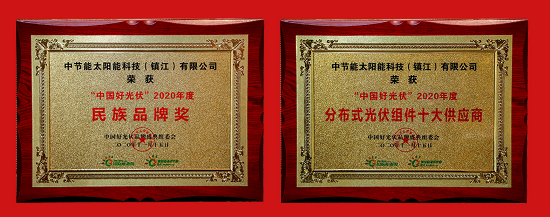 ??????中節(jié)能太陽能股份有限公司黨委書記、董事長曹華斌在論壇對話中指出,習(xí)近平總書記提出的以國內(nèi)大循環(huán)為主體、國內(nèi)國際雙循環(huán)相互促進(jìn)的新發(fā)展格局,為光伏企業(yè)未來發(fā)展指明了方向,我們要堅定信心,抓住這個機(jī)會乘勢而上,努力做得更好! ????? 作為光伏行業(yè)極具影響力的獎項之一,中國好光伏品牌獎由能源行業(yè)權(quán)威媒體國際能源網(wǎng)全媒體平臺于2016年正式發(fā)起,今年為第五屆。該品牌獎旨在表彰光伏行業(yè)年度優(yōu)秀企業(yè),展現(xiàn)精英企業(yè)風(fēng)采;提高企業(yè)品牌形象,擴(kuò)大優(yōu)秀企業(yè)品牌影響力;推廣先進(jìn)創(chuàng)新技術(shù)和創(chuàng)新模式,推動市場有序競爭;凝聚榜樣力量,提升行業(yè)整體競爭力和影響力。 ?????? 憑借優(yōu)秀的技術(shù)創(chuàng)新能力和品牌影響力,中節(jié)能太陽能鎮(zhèn)江公司斬獲“中國好光伏·2020年度民族品牌獎”、“中國好光伏·2020年度分布式光伏組件十大供應(yīng)商”兩項大獎。