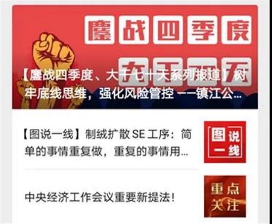 ????? 唱響主旋律,傳播正能量。四季度黨群文化部利用微信公眾號(hào)宣傳載體發(fā)稿約60余篇,重點(diǎn)策劃“鏖戰(zhàn)四季度、大干七十天系列報(bào)道”15篇、“圖說(shuō)一線系列報(bào)道”12篇,展現(xiàn)各個(gè)部門(mén)、各個(gè)工序四季度大干、苦干的精神面貌,營(yíng)造濃厚的宣傳氛圍;不斷創(chuàng)新宣傳方式,打好宣傳組合拳,在做好微信公眾號(hào)、官網(wǎng)、OA傳統(tǒng)宣傳媒介的基礎(chǔ)上,通過(guò)開(kāi)通視頻號(hào)、抖音號(hào),擴(kuò)大公司知名度和品牌影響力。