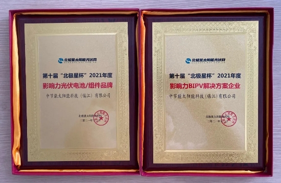 ? 2021年12月17日,第十屆“北極星杯”2021光伏影響力品牌評選頒獎典禮在南京完美落幕。經(jīng)過多輪角逐,中節(jié)能太陽能鎮(zhèn)江公司從眾多入圍者中脫穎而出,斬獲2021年度“影響力光伏電池/組件品牌企業(yè)”及“影響力BIPV解決方案企業(yè)”兩項大獎。
