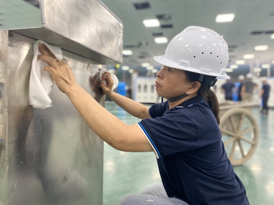 定制的不銹鋼工作臺(tái)已放置到新車(chē)間,生產(chǎn)人員正在對(duì)其進(jìn)行清理清潔