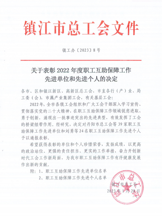鎮(zhèn)江公司榮獲鎮(zhèn)江市2022年度 職工互助保障工作先進(jìn)單位榮譽(yù)稱號(hào) |