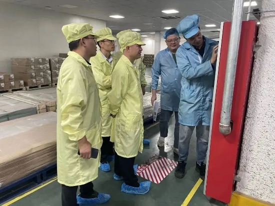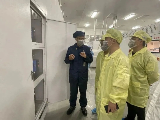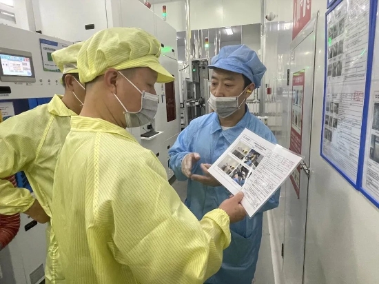 檢查小組深入鎮(zhèn)江公司生產(chǎn)一線,全面查看了特氣間、危險化學品庫、污水站、配電房等安全環(huán)保防護設施的設置及運行情況,通過邊看、邊聽、邊問,實地了解生產(chǎn)工藝流程,認真詢問員工對本崗位安全風險管控措施掌握程度及現(xiàn)場落實情況。