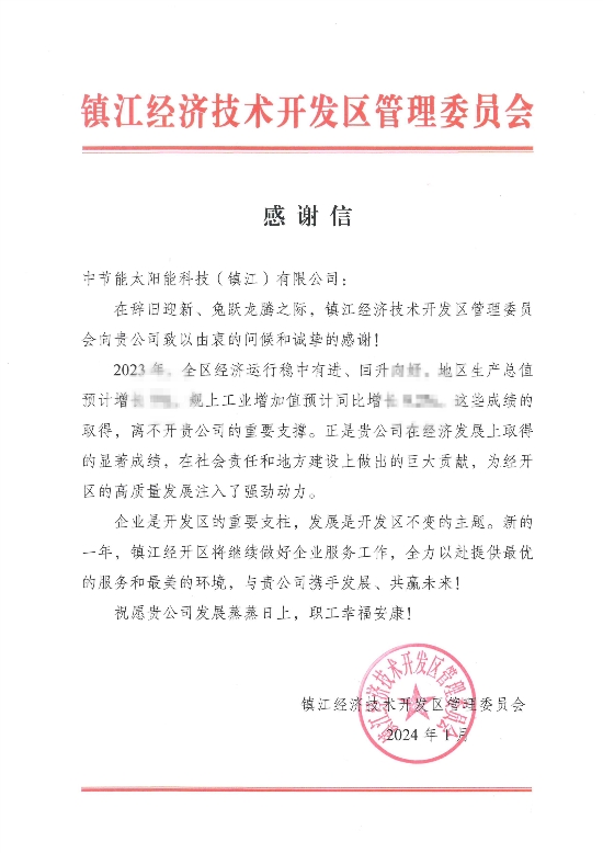 ? ? ? ? 近日,鎮(zhèn)江公司收到鎮(zhèn)江經(jīng)濟技術(shù)開發(fā)區(qū)管理委員會感謝信,向鎮(zhèn)江公司長期以來對鎮(zhèn)江經(jīng)開區(qū)經(jīng)濟社會發(fā)展作出的突出貢獻表示感謝。