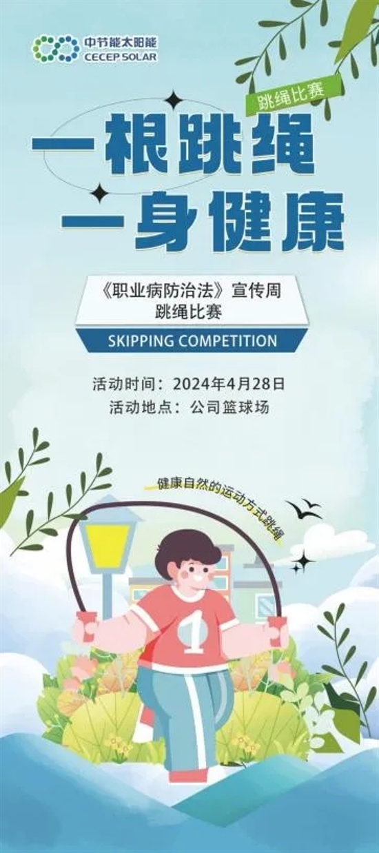 “悅跳悅健康”跳繩比賽 4月28日,鎮(zhèn)江公司將舉辦“悅跳悅健康”跳繩比賽,引導(dǎo)職工自覺踐行健康生活方式,做自己健康的第一責(zé)任人,“遇‘健’更好的自己”。