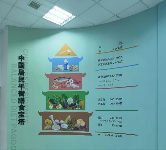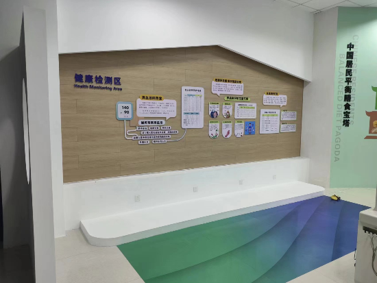 該區(qū)域配置健康一體機(jī),可以完成心電圖、血糖、血壓、血氧飽和度、脂肪含量及身高體重等15項(xiàng)檢查,檢測結(jié)果可以形成檢測報(bào)告,隨時可通過手機(jī)端查看,檢查過程方便快捷,職工隨時可以監(jiān)測自己的健康狀況。 營養(yǎng)健康角