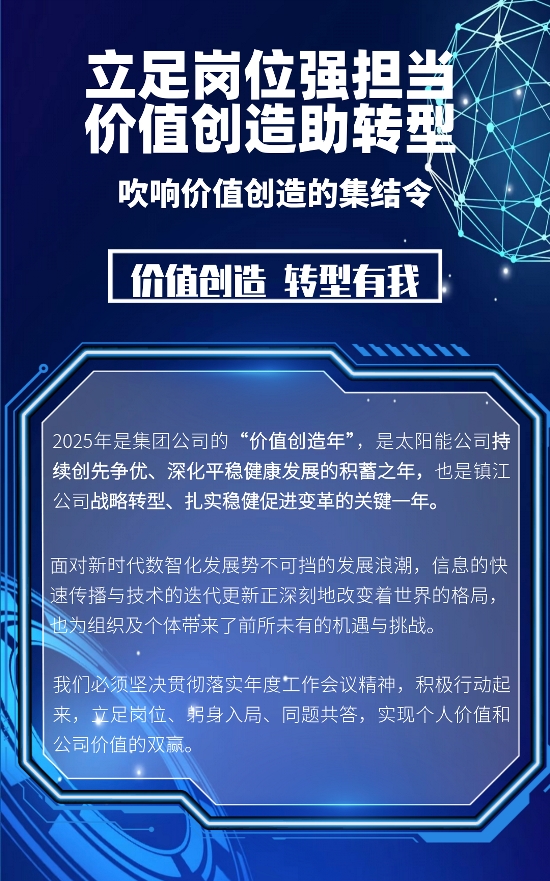 讓我們進一步轉(zhuǎn)變作風、自我變革、深入挖潛、躬身入局、提升方法、轉(zhuǎn)化實效,持續(xù)創(chuàng)先爭優(yōu),爭做價值創(chuàng)造的放大器,攜手鍛造鎮(zhèn)江公司科技轉(zhuǎn)型新優(yōu)勢,助力太陽能公司平穩(wěn)健康發(fā)展再上新臺階。