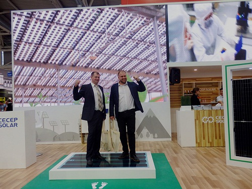 CECEP exhibited its four modules, of which the PVB double-glass module commanded rapt attention. The pioneering PVB double-glass module, with higher loading and good impact resistance, still can ensure zero mirco-crack when loading 1,200 kg. The color PVB double-glass module, placed in the center of the exhibition booth for trampling test, remained intact with zero micro-crack after being trampled upon by many visitors.? The PVB double-glass module and the high-efficiency PERC module, both enjoying uniqueness and superb quality, drew a lot of attention and won favor for CECEP’s booth. More notably, 10-plus countries, including India, Germany, Britain, Turkey, the Netherlands and Belgium, and over 30 companies actively sought in-depth cooperation with CECEP. While the exhibition was going on, many companies were already making appointments with CECEP as to the time for post-exhibition further business negotiations. It is believed that the fruits of this exhibition would lay a solid foundation for CECEP to penetrate the global market. During the exhibition, CECEP’s booth attracted many influential media and honored guests, of which the editor of PV Magazine, a famous photovoltaic magazine, interviewed Yang Lei, General Manager of CECEP, and Dr. Zhou Su from CECEP’s R&D Center, and positively commented on CECEP’s PVB double-glass products and its capability for technological innovation.