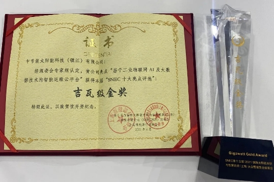 A series of benchmark products were exhibited in the exhibition hall of CECEP Solar Energy Technology (Zhenjiang) Co., Ltd. in this exhibition, which mainly includes the high-profile new generation of large-size ultra-high power modules and off-grid systems. In the meanwhile, the intelligent operation and maintenance platform of photovoltaic power stations independently developed by the company was displayed for the first time, and the control system of building data sharing and the integration of coordination and response was shared, which showed the “hard power” of the intelligent manufacturing of the company and attracted exhibitors to visit for a long time. In addition, there were also relevant keynote speeches on the main products and intelligent cloud platforms of the company, which attracted a large number of visitors to listen. The engineers of CECEP Solar Energy Technology (Zhenjiang) Co., Ltd. made an excellent presentation and shared the ultra-high efficient modules, BIPV modules, intelligent cleaning systems, off-grid systems and future development plans at the scene. At the “conference of ten highlights” held by the sponsor, a wonderful report on the intelligent operation and maintenance platform was made to introduce modern, intelligent and refined centralized management of assets and equipment built by the company and the advantages and development plans of intelligent operation and maintenance in detail. By actively promoting the implementation of the strategic goal of “digital CECEP”, striving to build a benchmark factory of digital cloud platform for intelligent manufacturing of high-efficiency photovoltaic cells and modules, and promoting the construction of the “energy saving cloud ecosystem”, CECEP Solar Energy Technology (Zhenjiang) Co., Ltd. provided customers with better intelligent manufacturing solutions that combine “hardware + software + cloud + integration + service” together. In the current “SNEC Top Ten Highlights Selection”, CECEP Solar Energy Technology (Zhenjiang) Co., Ltd. won the “Gigawatt Gold Award” for its “intelligent operation and maintenance cloud platform based on industrial Internet AI and big data technology”.