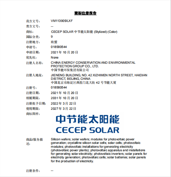 As we all know, trademarks are the important carriers of brands and the most important intellectual property and intangible assets of enterprises. As a photovoltaic manufacturing enterprise under CECEP, Zhenjiang Company has always insisted on realizing enterprise development through brand building up, improving brand management level, upgrading brand asset value, and making unremitting efforts for the healthy and sustainable development of the brands of central enterprises. The successful registration this time is another practice of Zhenjiang Company to actively maintain brand assets and strengthen brand image, and it also has a positive influence on Zhenjiang Company to open up its EU and the whole overseas market, build its own brand for foreign trade and export, expand the influence of photovoltaic central enterprises and enhance its international brand image. In the global economic integration today, the brand has become an important embodiment of enterprise competitiveness. While helping to build a unified market in the whole country, Zhenjiang Company actively practices the strategy of "Going Out", deepens market expansion, continuously builds "business cards" of central enterprises going international, strives to enhance the recognition of corporate brands by customers both at home and abroad, actively implements the principle of "loving the party, the country and the enterprise", and presents outstanding achievements to the 20th National Congress of the Communist Party of China (CPC). Author: CECEP Solar Energy Technology (ZhenJiang) Co., Ltd.